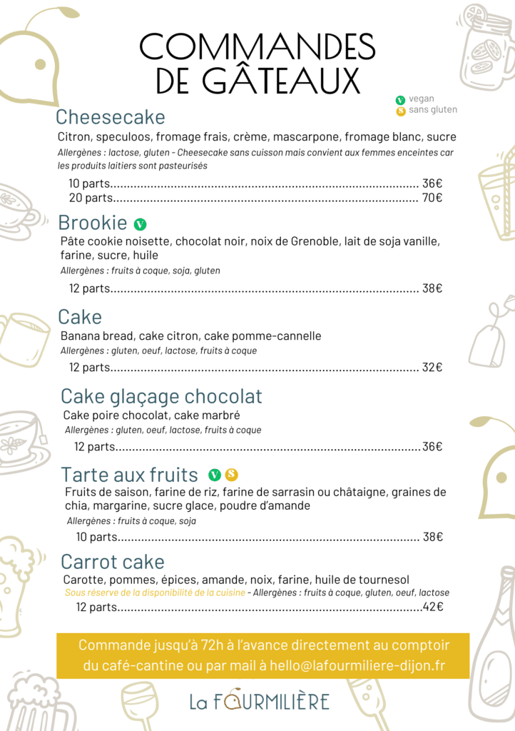 Alors, ça y est, c’est dit et c’est même affiché au comptoir du café-cantine ! Cheesecake, brookie, cake, tarte et même carrot cake… Vous pouvez nous en commander jusqu’à 72h à l’avance, auprès de nous au comptoir du café, par message sur les réseaux sociaux ou par mail à hello@lafourmiliere-dijon.fr !